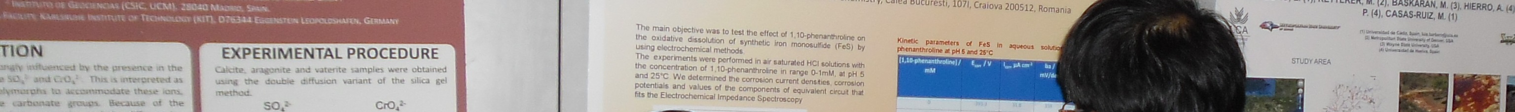 YEAR 2013 1. 14th International Symposium on Water-Rock Interaction, WRI 14 , Avignon, France, June 9-14, 2013. Effect of inorganic anions on FeS oxidative dissolution. CHIRITA P., CONSTANTIN C.A., SCHLEGEL M.L. 2. Goldschmidt Conference 2013, Florence, Italy, August 25-30, 2013. The effect of 1,10-phenanthroline on the oxidative dissolution of iron monosulfide (FeS). BADICA C.E., CHIRITA P. 3. Goldschmidt Conference 2013, Florence, Italy, August 25-30, 2013. The effect of some new organic inhibitors on the oxidative dissolution of iron monosulfide (FeS). CONSTANTIN C.A., CHIRITA P., BADICA C.E., BIRSA L.M., MATEI E., BALTOG I., SCHLEGEL M.L. 4. 15th European Conference on Applications of Surface and Interface Analysis, Cagliari, Italy, October 13 - 18, 2013. Influence of 2,2'-bipyridine on oxidative dissolution of iron monosulfide (FeS). CHIRITA P., BADICA C.E., CONSTANTIN C.A., BIRSA L.M., MATEI E., BAIBARAC M. 5. 15th European Conference on Applications of Surface and Interface Analysis, Cagliari, Italy, October 13 - 18, 2013. Inhibition of iron monosulfide (FeS) oxidative dissolution in air saturated acidic solutions by O-ethyl-S-2-(2-hydroxy-3,5-diiodophenyl)-2-oxoethylxantogenate. CHIRITA P., CONSTANTIN C.A., BADICA C.E., BIRSA L.M., MATEI E., BALTOG I. YEAR 2014 1. Goldschmidt Conference 2014, Sacramento, USA, June 8-13, 2014. The effect of some synthetic organic compounds on the oxidative dissolution of iron monosulfide (FeS). BADICA C.E., DUINEA M.I., BIRSA L.M., BAIBARAC M.A., MATEI E., CHIRITA P. 2. Goldschmidt Conference 2014, Sacramento, USA, June 8-13, 2014. Kinetics and mechanism of iron monosulfide (FeS) oxidative dissolution. DUINEA M.I., BADICA C.E., CHIRITA P. 3. Goldschmidt Conference 2014, Sacramento, USA, June 8-13, 2014. Effect of sulfosalicylic acid on iron monosulfide (FeS) oxidative dissolution in aerated acidic solutions. DUINEA M.I., BADICA C.E., SCHLEGEL M.L., CHIRITA P. 4. Geochemistry of the Earth's surface (GES-10) Paris, France, August 18-22, 2014. The oxidative dissolution of FeS at pH 2.5 in the presence of ethylenediaminetetraacetate (EDTA). CHIRITA P., DUINEA M.I., BADICA C.E., SCHLEGEL M.L. 5. Geochemistry of the Earth's surface (GES-10) Paris, France, August 18-22, 2014. Electrochemical investigation of the mechanism of aqueous oxidation of pyrite by oxygen. DUINEA M.I., CHIRITA P., POPA I., SCHLEGEL M.L. 6. Conferinta Nationala de Chimie, Caciulata, Romania, Octomber 01-03, 2014. Oxidarea monosulfurii de fier cu KMnO4. POPA I., DUINEA M.I., CHIRITA P. 7. Conferinta Nationala de Chimie, Caciulata, Romania, Octomber 01-03, 2014. Efectul glicinei asupra dizolvarii oxidative a monosulfurilor de fier (FeS). DUINEA M.I., POPA I., CHIRITA P. YEAR 2015 1. 5th Regional Symposium on Electrochemistry South - East Europe, June 7-11, 2015, Pravets, Bulgaria. The effect of organic compounds on the oxidative dissolution of chalcopyrite (CuFeS2). DUINEA M.I., SANDU A.M., BIRSA L.M., MATEI E., BAIBARAC M. CHIRITA P. 2. 5th Regional Symposium on Electrochemistry South - East Europe, June 7-11, 2015, Pravets, Bulgaria. The oxidative dissolution of galena (PbS) in the presence of hydrogen peroxide. SANDU A.M., DUINEA M.I., CHIRITA P. 3. 19th Romanian International Conference on Chemistry and Chemical Engineering, September 2-5, 2015, Sibiu, Romania. The effect of organic compounds on oxidative dissolution of sphalerite (ZnS). DUINEA M.I., SANDU A.M., BIRSA L.M., MATEI E., BAIBARAC M., CHIRITA P. 4. 19th Romanian International Conference on Chemistry and Chemical Engineering, September 2-5, 2015, Sibiu, Romania. The effect of alanine on the oxidative dissolution of pyrite (FeS2). SANDU A.M., DUINEA M.I., CHIRITA P. YEAR 2016 1. International Conference of Physical Chemistry – ROMPHYSCHEM, September 21-24, 2016, Galati, Romania. The oxidative dissolution of pyrite (FeS2) in the presence of sodium carbonate. The use of carbon paste electrodes (CPE). PETCU M., DUINEA I.M., CHIRITA P. 2. International Conference of Physical Chemistry – ROMPHYSCHEM, September 21-24, 2016, Galati, Romania. The inhibiting effect of Tris (hydroxymethyl) aminomethane (TRIS) on the corrosion of iron. DUINEA I.M., PETCU M., BIRSA M.L., CHIRITA P. |