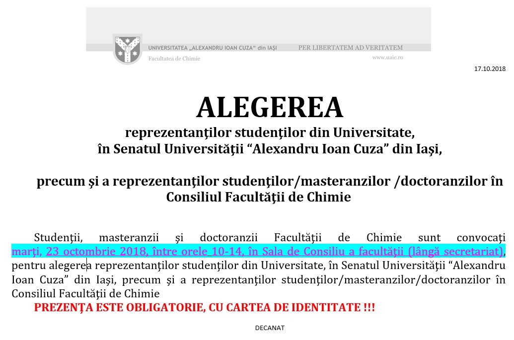 Alegerea reprezentanţilor studenţilor din Universitate în Senatul Universităţii “Alexandru Ioan Cuza” din Iaşi, precum şi alegerea reprezentantilor studentilor, masteranzilor si doctoranzilor in Consiliul facultatii