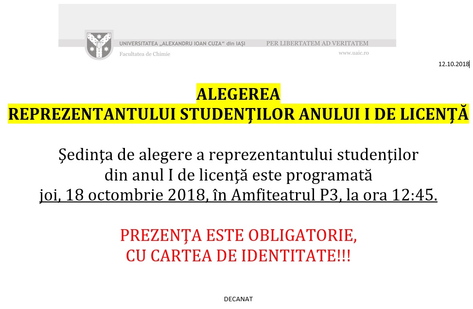Alegerea reprezentanţilor studenţilor din Universitate în Senatul Universităţii “Alexandru Ioan Cuza” din Iaşi, precum şi alegerea reprezentantilor studentilor, masteranzilor si doctoranzilor in Consiliul facultatii