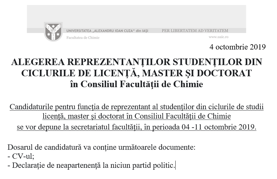 ALEGEREA REPREZENTANTILOR STUDENTILOR DIN CICLURILE DE LICENTA, MASTER ŞI DOCTORAT, în Consiliul Facultatii de Chimie