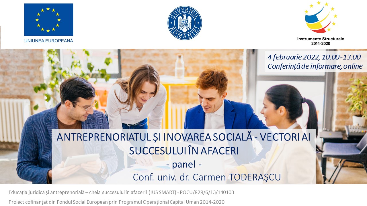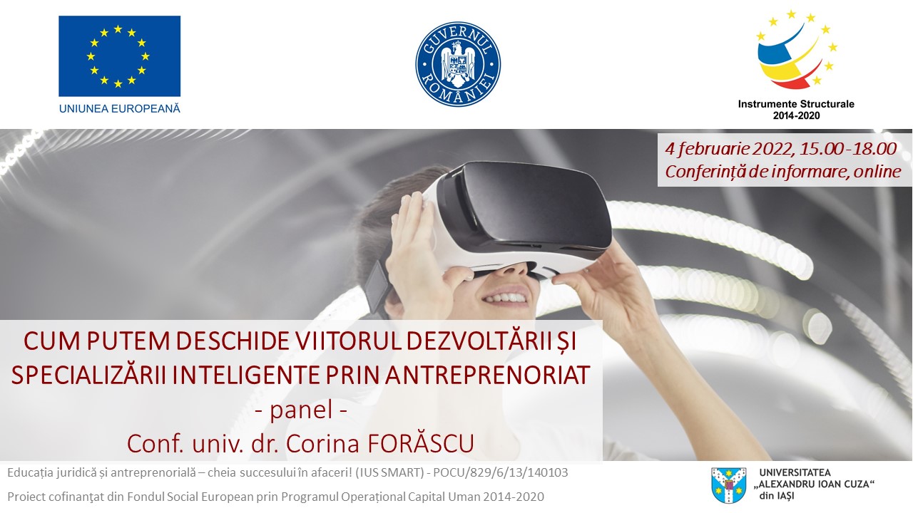 Vineri, 4 februarie 2022, ora 15.00 poți afla despre strategiile de dezvoltare inteligentă și obiectivele de dezvoltare durabilă, toate acestea în corelație cu antreprenoriatul de la Conf. univ. dr. Corina FORĂSCU.