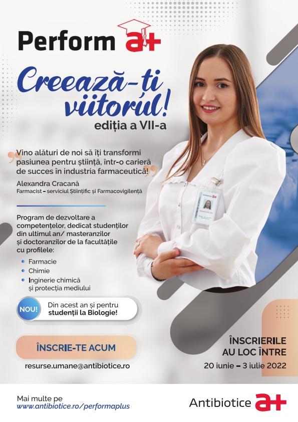 Studenții din anul III de licenţă, masteranzii şi doctoranzii dornici să urmeze o carieră în industria farmaceutică au acum posibilitatea să se înscrie la cea de-a șaptea ediție a programului de dezvoltare a competențelor profesionale, Perform a+, susținut de compania Antibiotice.