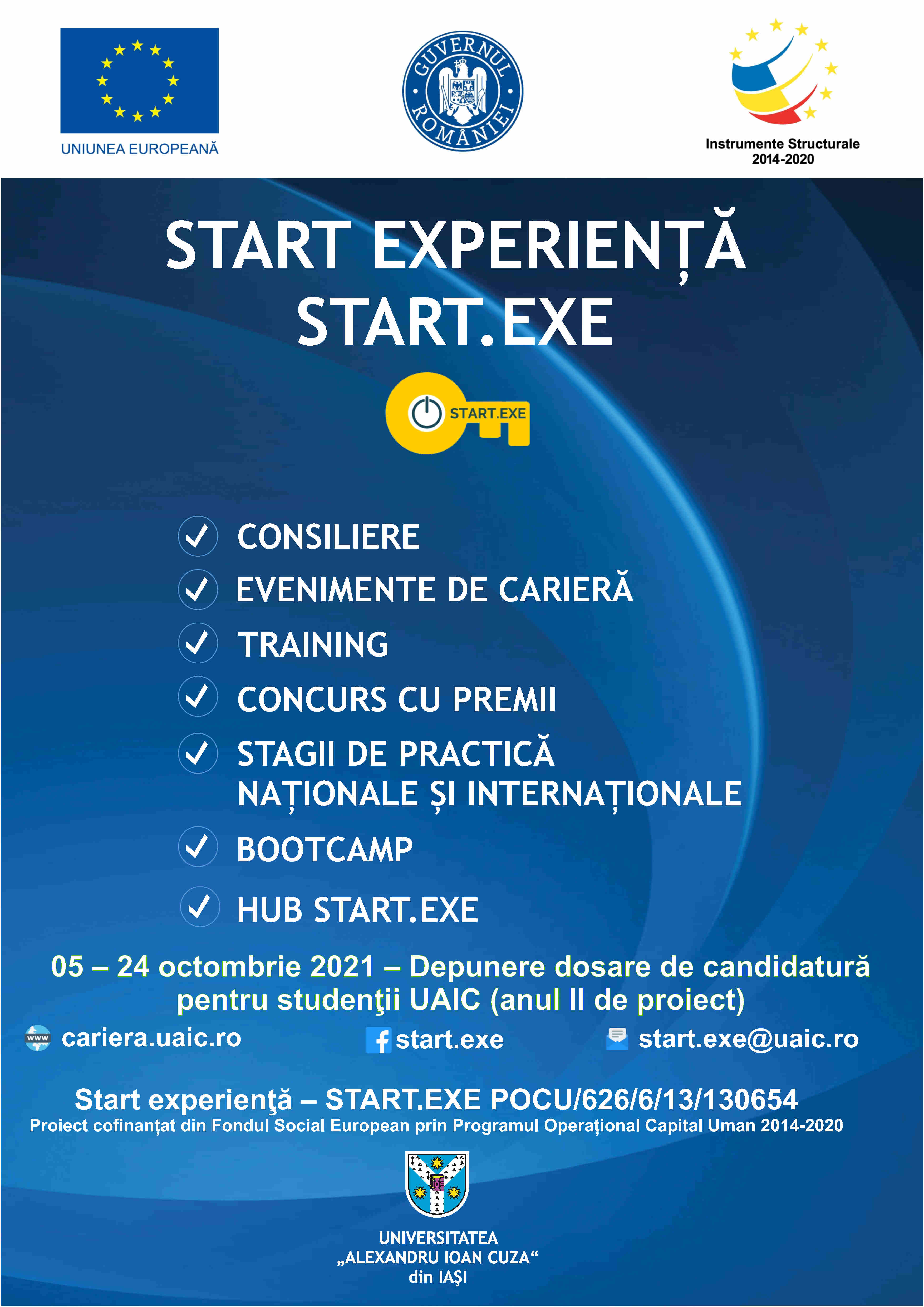 Pentru detalii despre proiect şi informaţii suplimentare cu privire la grupul ţintă al proiectului, vă rugăm să ne contactaţi pe adresa de email start.exe@uaic.ro.