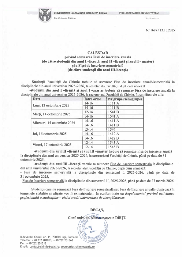 Calendar de semnare a Fişei de inscriere anuală sau semestrială, la disciplinele din anul universitar 2025 2026