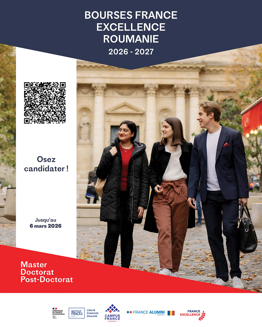 La Institutul Francez din România din Iași (str. Cuza Voda nr. 2, Palatul Braunstein, etajul 1), joi, 26 februarie 2026, la ora 17:00, va avea loc o sesiune de informare și prezentare a burselor „France Excellence Roumanie”.
