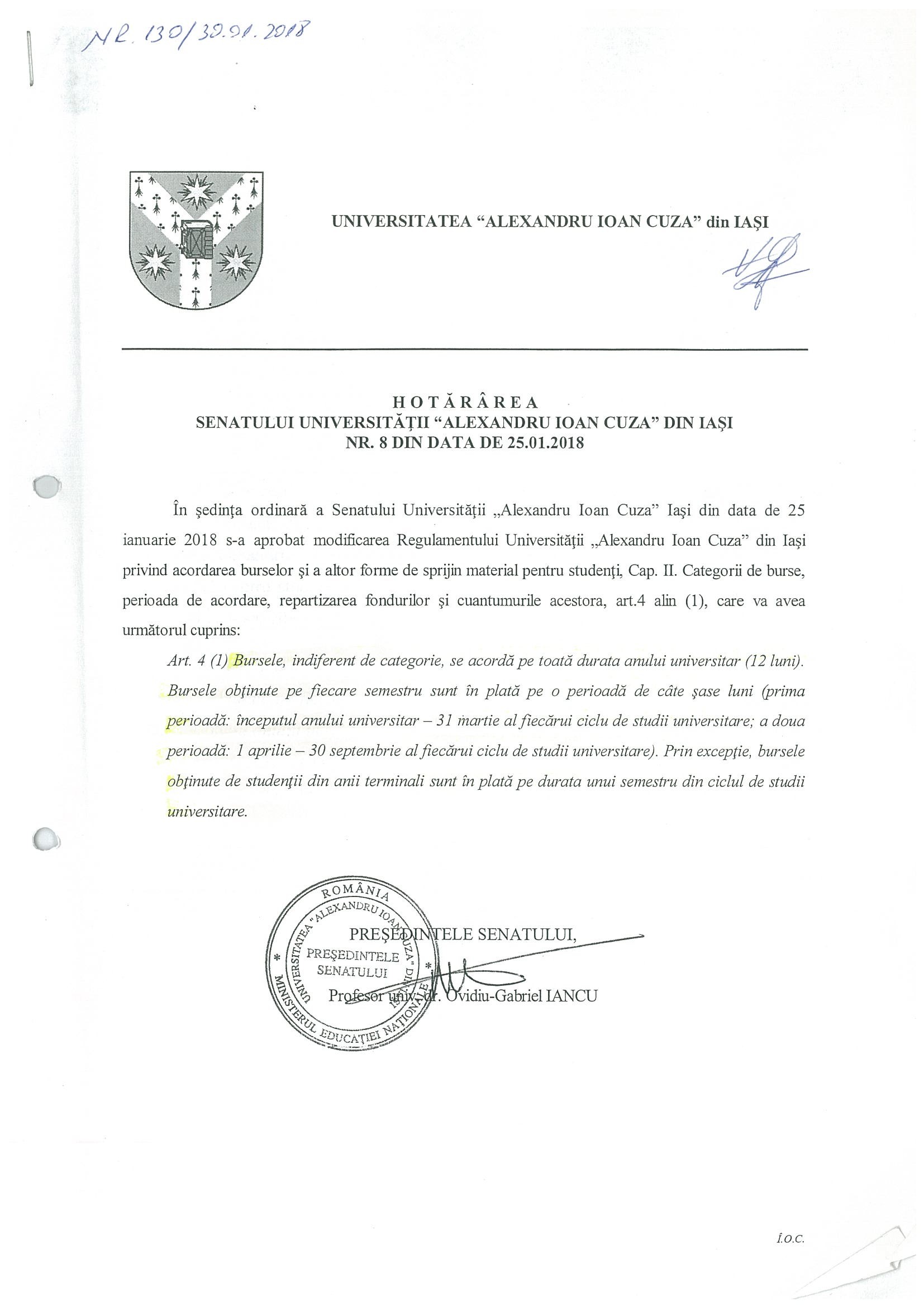 Hotărârea Senatului UAIC nr. 8/25.01.2018 referitoarea la modificarea art. 4 alin (1)