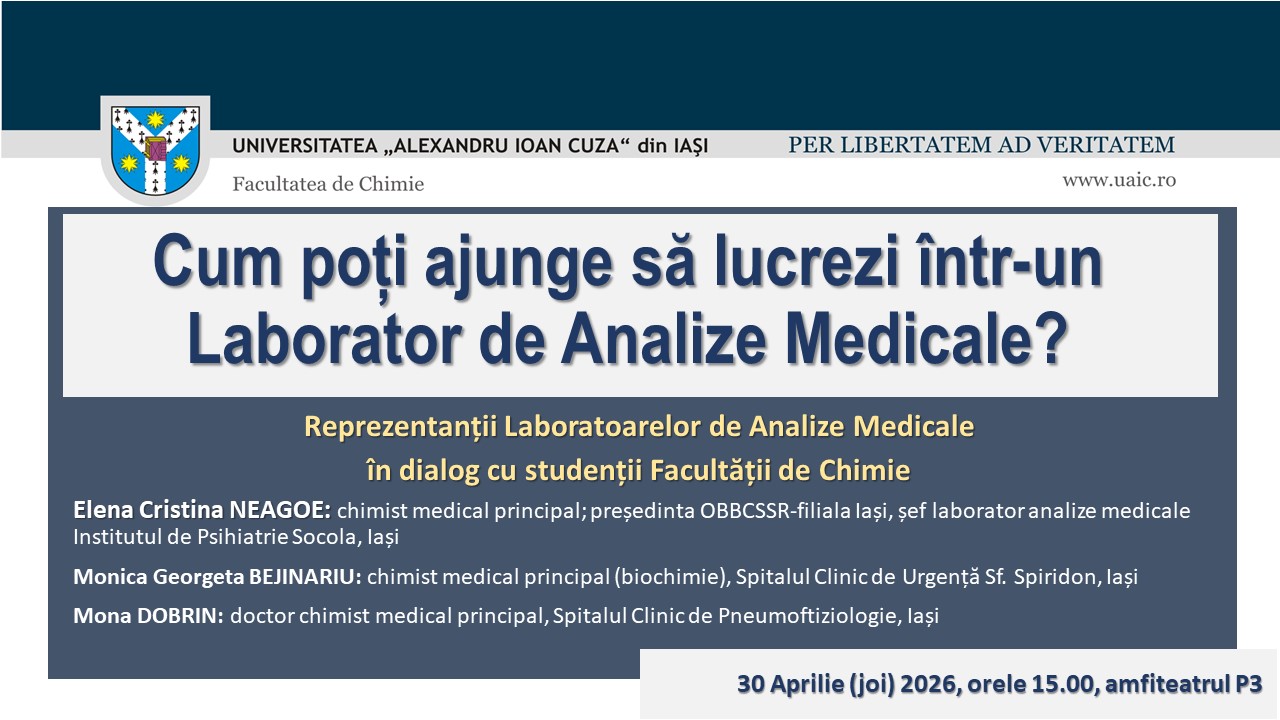 30 aprilie 2026 - INVITAŢIE la întâlnirea reprezentanţilor Laboratoarelor de Analize Medicale cu studenţii Facultăţii de Chimie