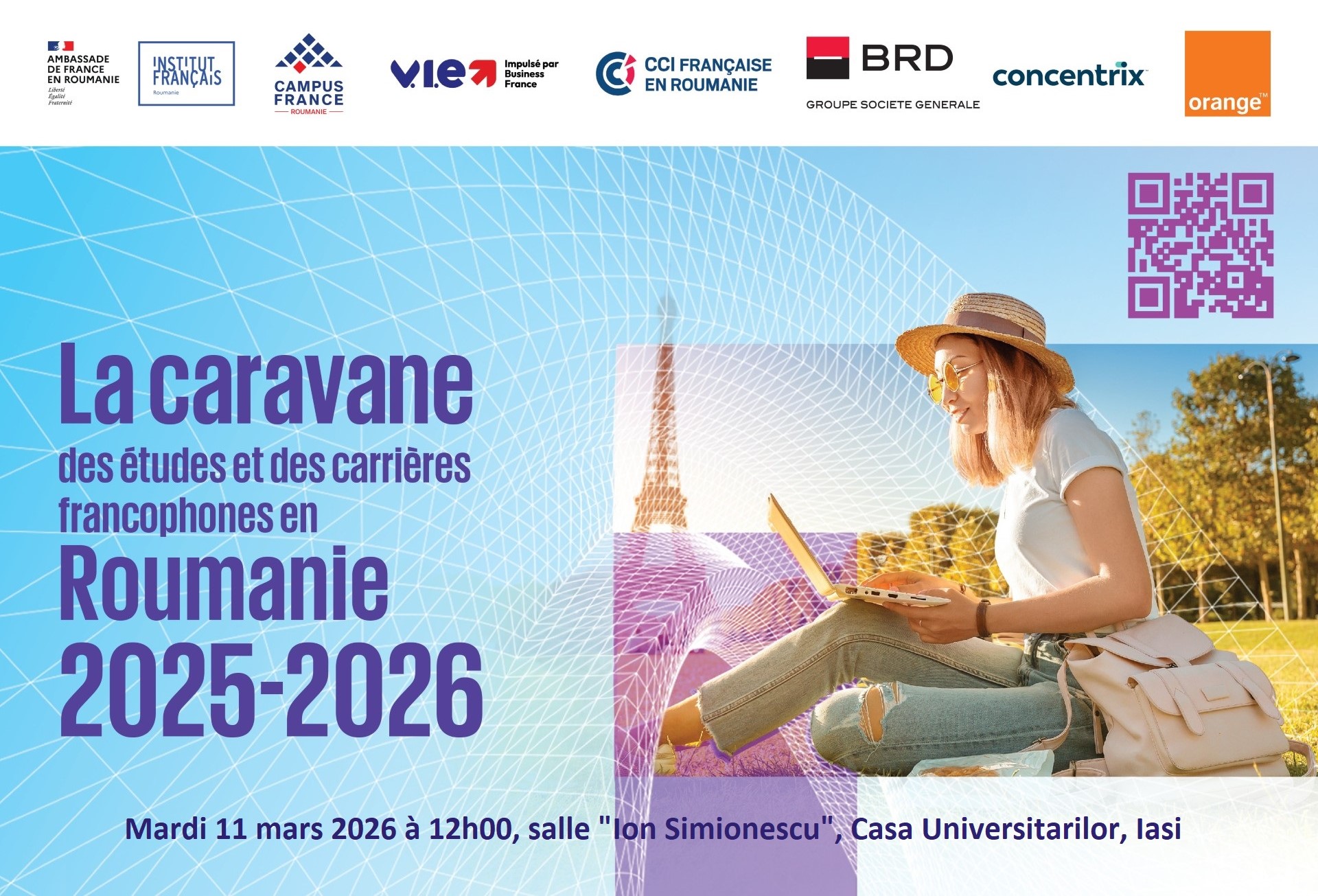 Studenții sunt invitați la evenimentul „Caravana studiilor și carierei francofone în România”, care va avea loc miercuri, 11 martie 2026, la ora 12:00, la Casa Universitarilor (etajul 1, sala Ion Simionescu), în prezența reprezentanților Institutului Francez/Campus France, a lectorului francez al UAIC, a foștilor bursieri în Franța și a Concentrix Iasi. Programul evenimentului include: prezentarea studiilor în Franța (mobilitate, burse...), mărturii ale foștilor bursieri, prezentarea oportunităților de carieră francofone în Iași.