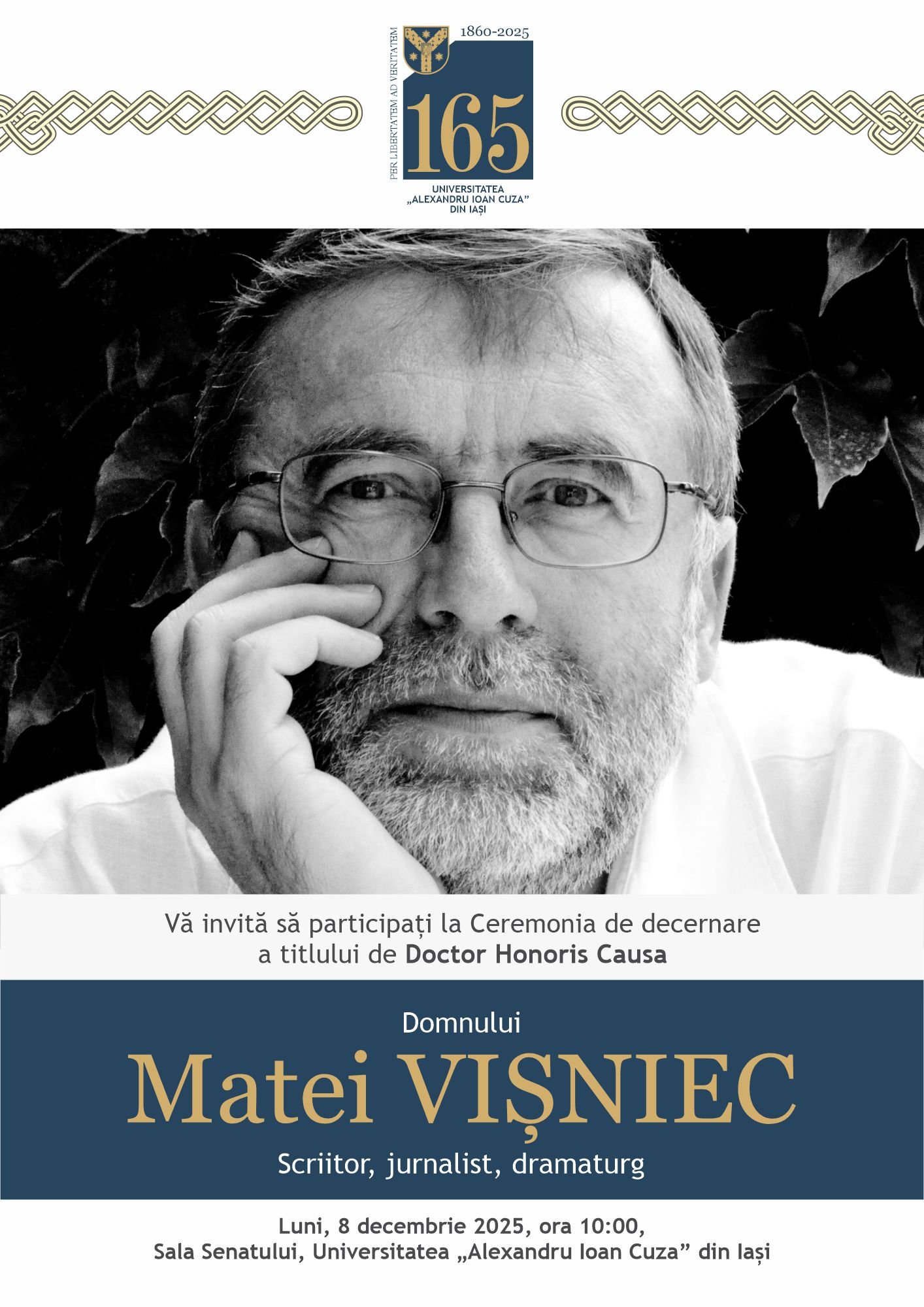 INVITAŢIE la Ceremonia de decernare a titlului de Doctor Honoris Causa al UAIC domnului Matei Vișniec, scriitor, jurnalist și dramaturg